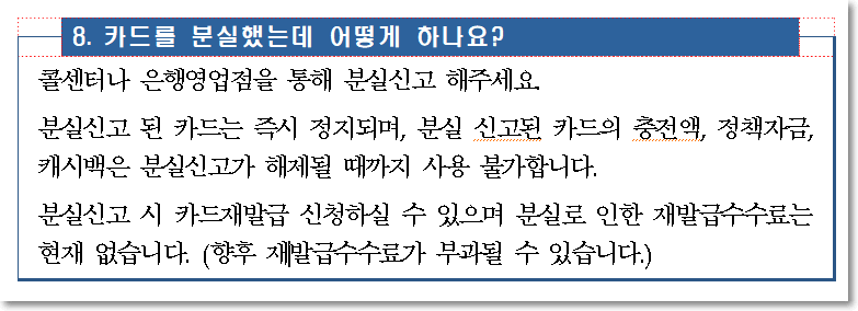 분실한 경우라면 바로 콜센터로 연락을 취하시기 바랍니다. 신고가 접수되면 카드가 즉시 정지되기 때문에 본인 돈을 지킬 수 있습니다. 그리고 재발급 신청으로 다시 이용하면 됩니다. 아직 재발급 수수료가 발생하지 않는다고 하네요