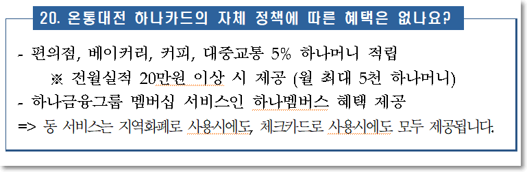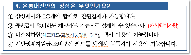 공식 홈페이지 Q&A 를 살펴보면 이런 내용이 설명되어 있습니다. 요즘 지갑 안들고 다니시는 분들 많으실텐데요. 핸드폰에 온통대전을 넣어두시고 사용하면 편리할 것 같습니다.