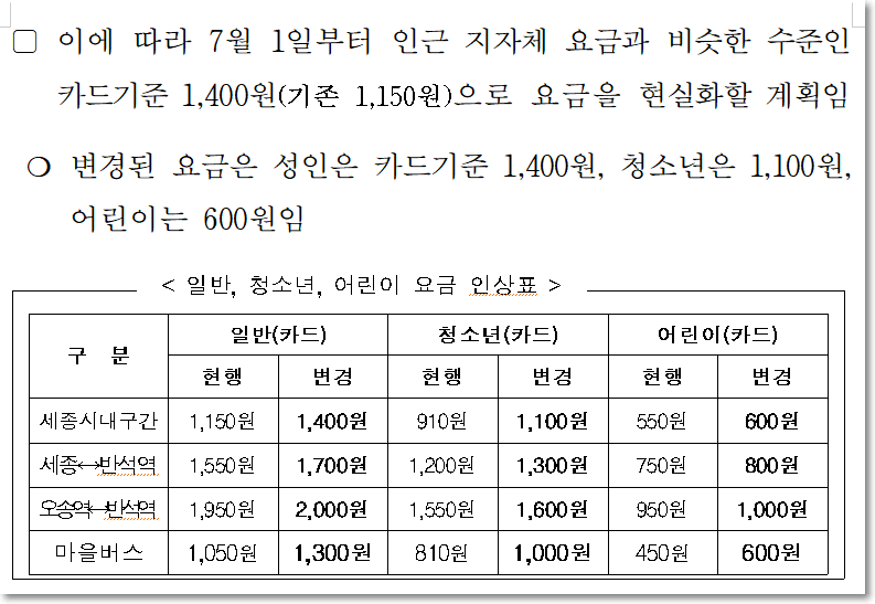 대신 버스요금이 인상됩니다. 세종시 버스요금이 시내구간에서 1400원으로 상승됩니다. 기존에 1,150원이었네요. 세종시에서 반석역까지는 1700원입니다. 오송역에서 반석역까지 2천원이구요.