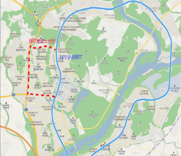 세종시에서 발표한 brt 보조노선 입니다. 세종시에는 내부순환 brt가 완성된 상태입니다. 그런데 1번국도 쪽에 접근성이 떨어져 이쪽을 보완하기 위한 순환노선을 만든다는 건데요