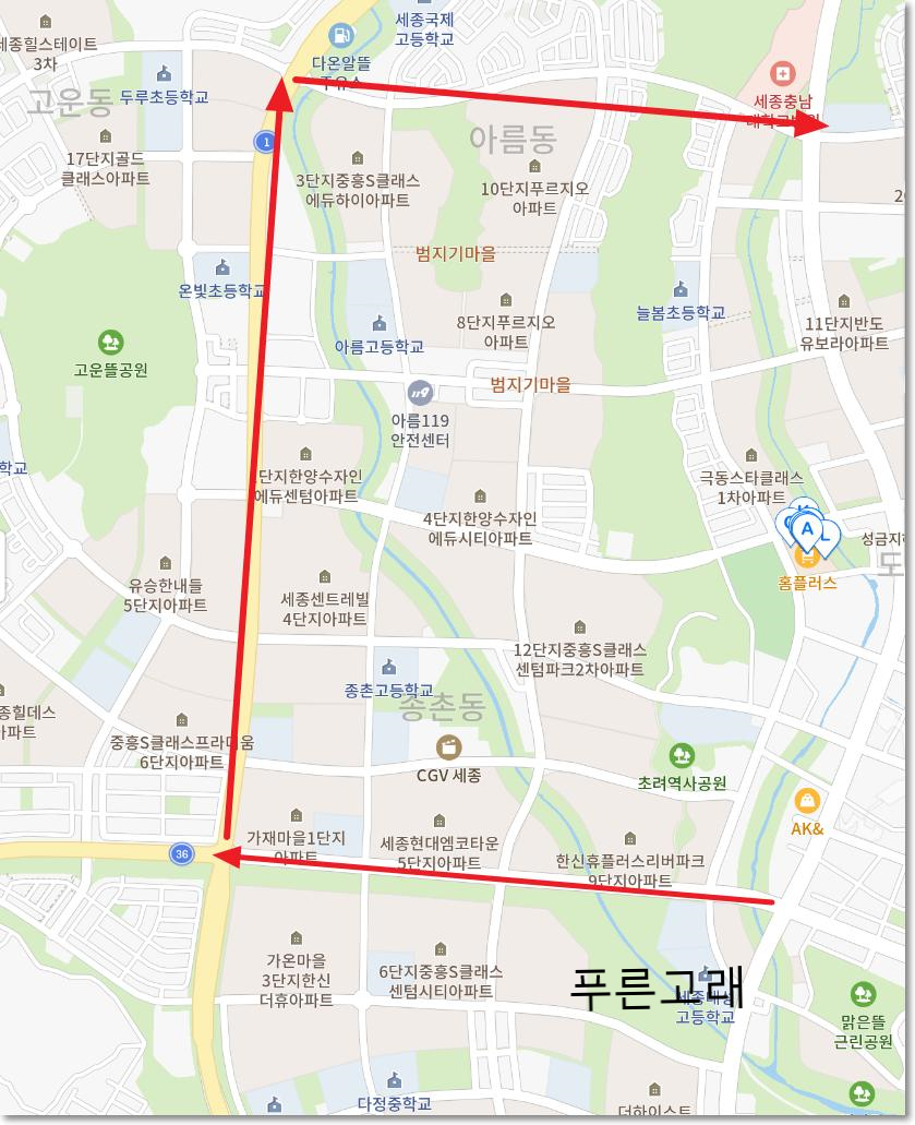 지도가 잘 안보여서 확대해서 그려봤습니다. 홈플러스를 기준으로 봤을때입니다. 기존에 종촌동과 아름동 고운동쪽이 좋겠네요. 아름동과 고운동은 지금까지 세종시에서 소외된 지역입니다. 보조 brt로 빛을 볼수 있을지 궁금하네요