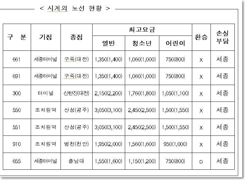 세종시에서 주변 공주나 천안 충남대로 가는 버스 노선 및 요금도 참고하세요 세종시는 지금 운영되는 시계외 추가 요금을 폐지하고 환승제도를 개선한다고 합니다.