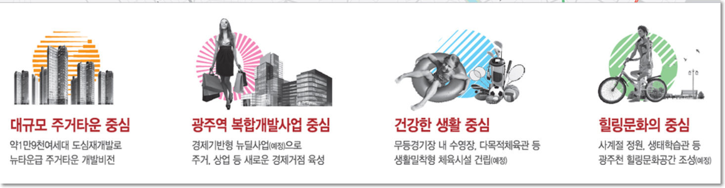장점으로 내세우는 것들인데요. 주변 도심재개발이 완료되면 약 1만9천세대로 구성된다고 합니다. 이걸 보면 향후 미래 가치는 있을 것 같습니다. 또 광주역 복합개발사업이 진행되는데 광주역과 가깝기 때문에 주변에도 그 효과가 미칠수 있을 것 같구요.