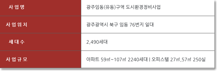 사업 개요를 보면 광주임동(유동)구역 도시환경정비사업이라고 나오네요. 그래서 임유동 재개발이라고 많이들 이야기 하셨던 것 같아요. 아파트가 2,240세대 오피스텔이 250세대입니다. 정말 엄청난 규모입니다.