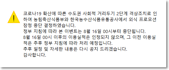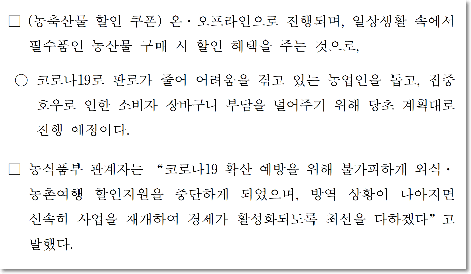 농축산물 할인쿠폰은 농산물 구매시 할인혜택을 주는건데요. 이 행사는 중단안된다고 합니다. 농업인들을 돕기 위한 조치라고 생각되네요