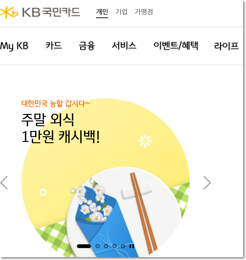 위 그림에서 보시는 것처럼 외식업소에서 주말!(금요일 오후4시부터 토요일 일요일 자정)에 2만원 이상 5번 카드 사용하면 6번째 1만원을 캐시백 또는 청구차감해주는 이벤트인데요. 10만원 이상 사용시 만원 할인이라고 보시면 되겠네요.