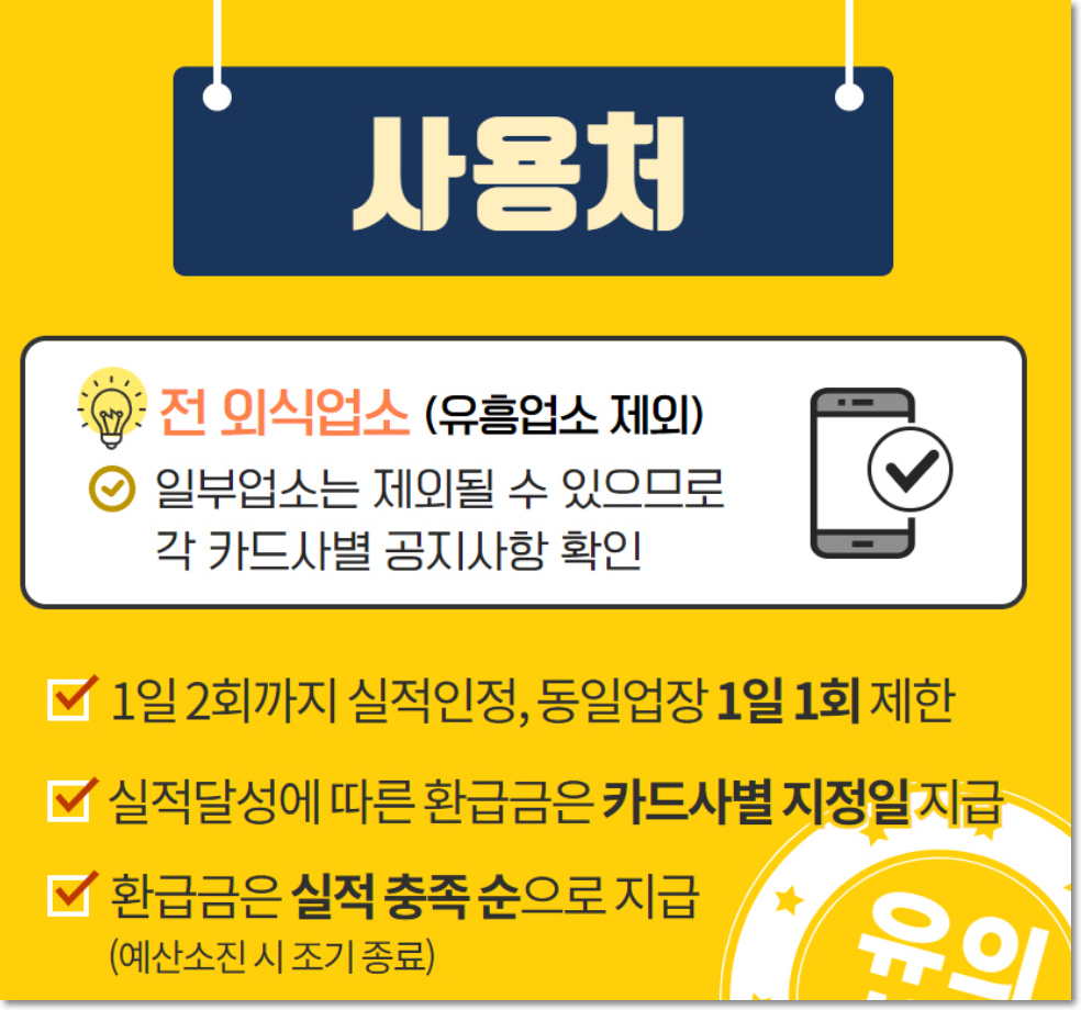 외식업소(유흥업소 제외) 전체에서 사용한 실적이 인정됩니다. 환급금은 예산내에서 지급되구요. 실적 충족 된 순서대로 환급금을 지급합니다. 예산소진시 조기종료되므로 빨리 해야겠네요