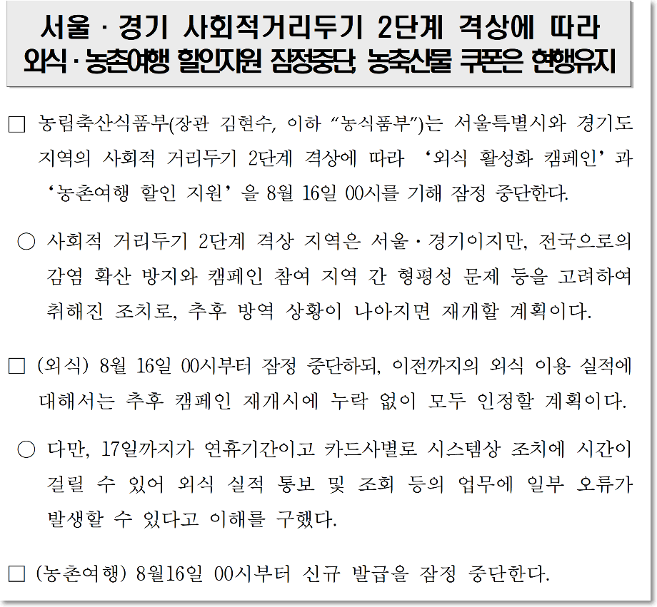 정부에서는 요즘 침체된 외식산업을 활성화 하기 위해서 농림축산식품부에서 다양한 할인행사를 진행한다고 발표했는데요. 이것도 코로나 확산에 따라 다시 축소될 것으로 보이네요