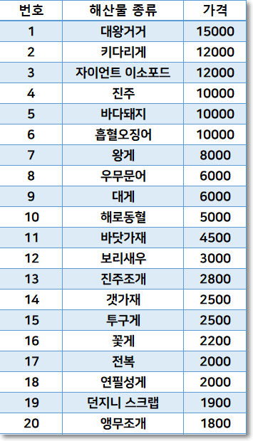 오늘은 동물의 숲에서 나오는 해산물들의 가격을 정리해 보겠습니다.