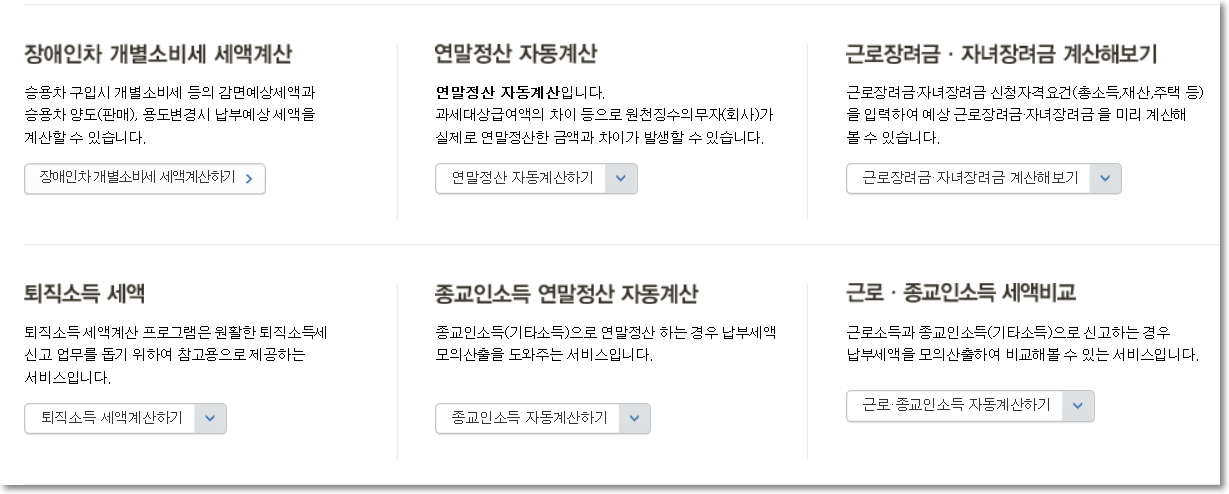 위 사진을 보시면 홈택스에서 제공하는 다양한 계산기들이 있습니다. 연말정산도 있고 퇴직소득 세액도 있네요 심지어 종교인소득 연말정산 자동계산도 되나봅니다.