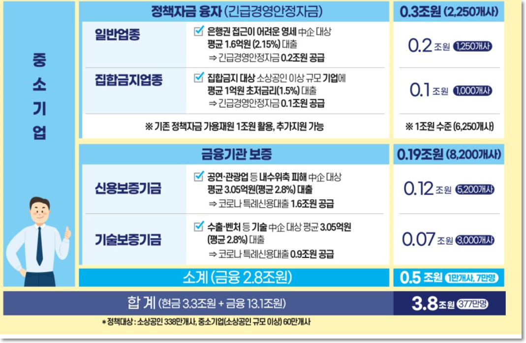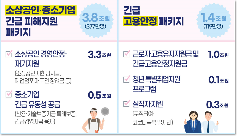 요즘 피해를 많이 보고 있는 소상공인과 중소기업을 지원하기 위해 3,8조원이 들어갑니다. 대상이 377만명이나 되나 봅니다. 그리고 고용안정을 위해서도 1.4조원의 돈이 들어가네요. 여기에 청년 특별취업지원 프로그램이나 실직자 지원 예산이 포함되어 있습니다.