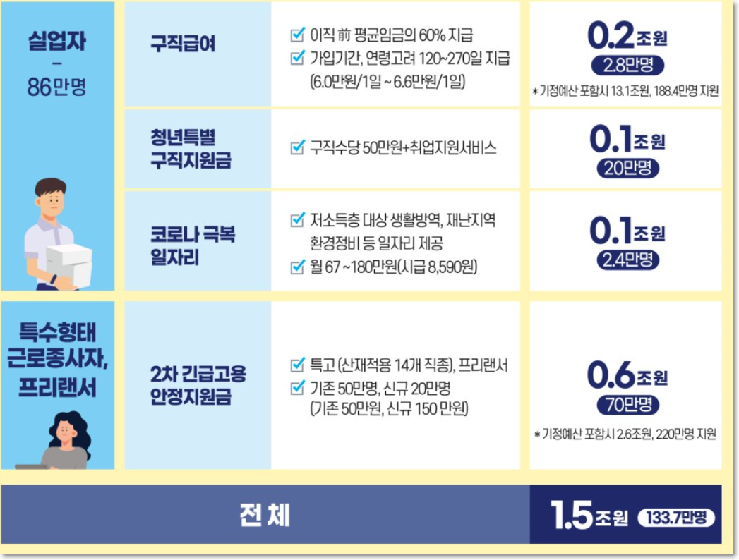또 실업자 대상으로 구직급여, 청년특별구직지원금 등이 지원됩니다. 그리고 특수형태 근로종사자와 프리랜서를 대상으로 고용안정지원금도 지급되구요