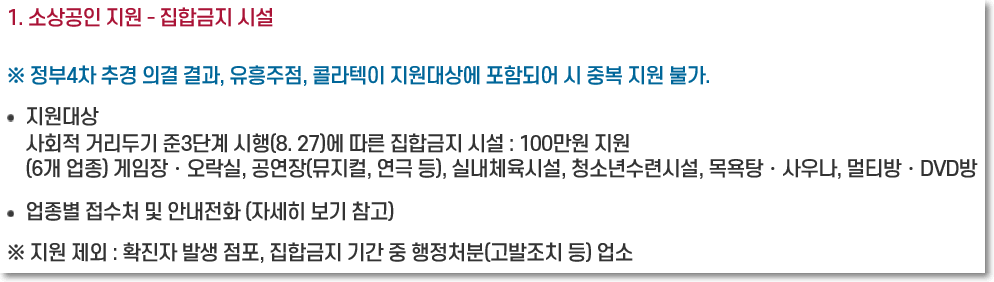 먼저 소상공인 지원 조건입니다. 집합금지 시설로 지정되었던 곳들에 대해 지원한다고 합니다. 지원금은 100만원입니다. 게임장이나 오락실, 공연장, 실내체육시설 등 일상생활에 밀접한곳들이네요. 사우나나 목요탕 멀티방 등도 대상입니다. 업종별 접수처 및 안내전화를 확인해보세요