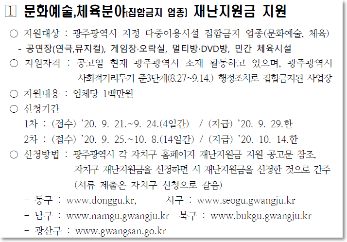 목욕탕 대상 재난지원금입니다. 사업자 등록증이 광주로 되어 있어야 합니다. 역시 지원금은 100만원입니다. 신청은 9월21일부터 25일까지입니다.