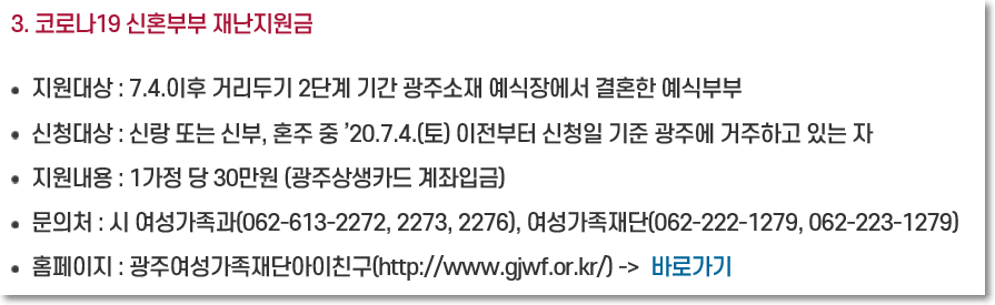 신혼부부 1가정당 30만원이 지원됩니다. 광주상생카드 계좌입금으로 진행되구요. 대상은 7.4~9.20일 광주 소재 예식장에서 결혼식을 올린 신혼부부 대상입니다. 또 광주에 주민등록이 되어있어야 한다고 하네요