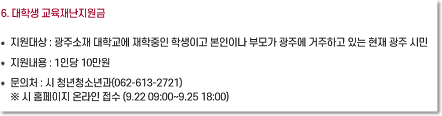 대학생에게도 코로나 지원금이 있습니다. 조건이 까다롭습니다. 광주소재 대학교에 재학하여야 하고 광주에 거주하여야 합니다. 1인당 10만원 지원됩니다. 이건 시 홈페이지에서 온라인 접수를 하여야 합니다. 신청기간은 9월25일까지였고 추석연휴 전 9.29일 지급된다고 하네요
