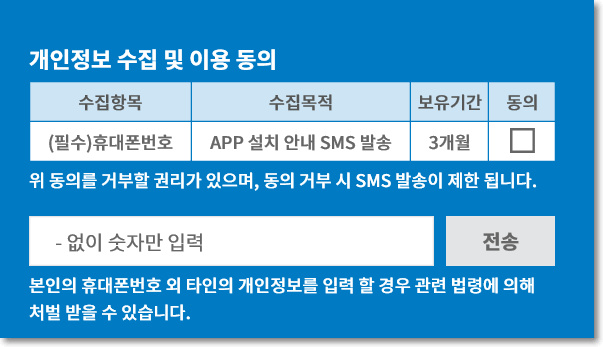 요즘은 스마트폰이 있어 더 찾아보기 쉬워졌어요. 홈페이지에서 이렇게 휴대폰 설치 문자요청을 하면 스마트폰으로 바로 앱을 설치하실 수 있답니다. 물론 플레이스토어 등에서도 다운로드 가능하구요