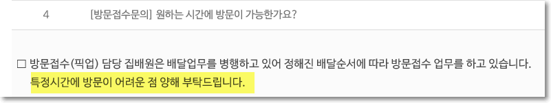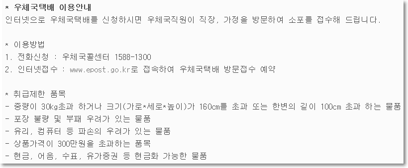 신청은 전화 또는 인터넷으로 가능합니다. 취급제한 품목은 위 사진에 있으니 짐을 보내기 전 미리 확인해 두시는게 좋겠습니다. 보시면 파손 우려가 있거나 300만원 초과 고가제품, 현금, 어음 수표 등 물품등이 택배접수가 안되네요