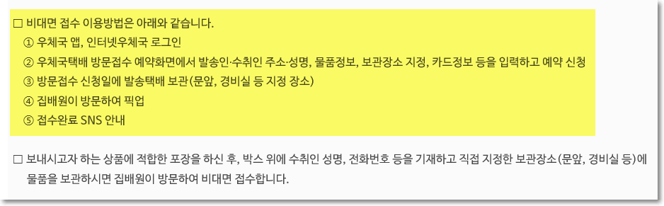 코로나19 감염때문에 택배서비스도 이제 비대면 접수가 가능합니다. 이용방법은 위 사진을 참고하시기 바랍니다. 우체국 앱이나 인터넷 우체국에서 처리가 가능합니다.