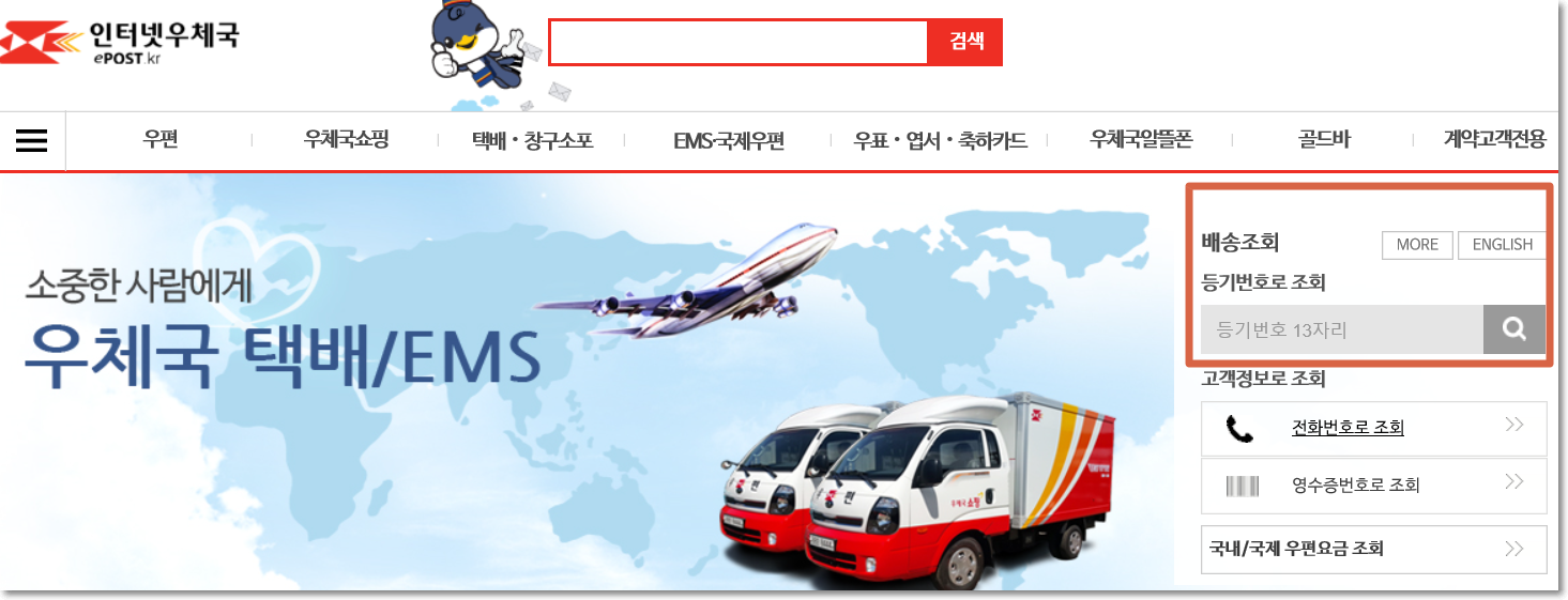 또 우체국 택배 배송조회를 통해 언제 올지도 확인이 가능합니다. 인터넷 우체국 접속하시면 가장 우측 상단에 등기번호로 배송조회를 할 수 있는 메뉴가 있습니다. 여기서 확인하시면 되구요.