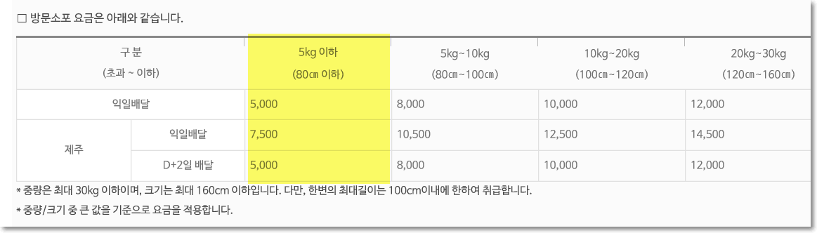 방문 접수로 진행되는 소포 요금은 위 표와 같습니다. 이는 창구에서 접수하는 비용보다 조금 더 추가된다고 보시면 되겠습니다. 보통 5kg이하 물건을 많이 보내실텐데요 익일 배송은 5천원 입니다. 또 제주도는 더 비싼거 당연하겠죠?