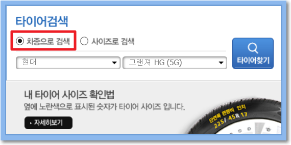 ABC홈페이지에서 보면 타이어 검색이 가능합니다. 차종으로도 검색이 가능하고 사이즈를 알고 있다면 사이즈로도 찾을수 있더라구요 . 차종을 그랜져로 해서 검색해 보았습니다.