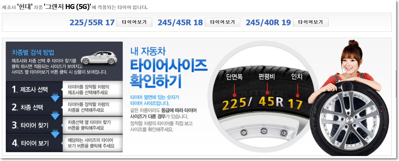그랜져 hg 모델 타이어를 검색해보니 세가지 규격이 나옵니다. 225/55/R17 245/45/R18 , 245/40/R19 이렇게 세가지 타이어 크기가 나옵니다.