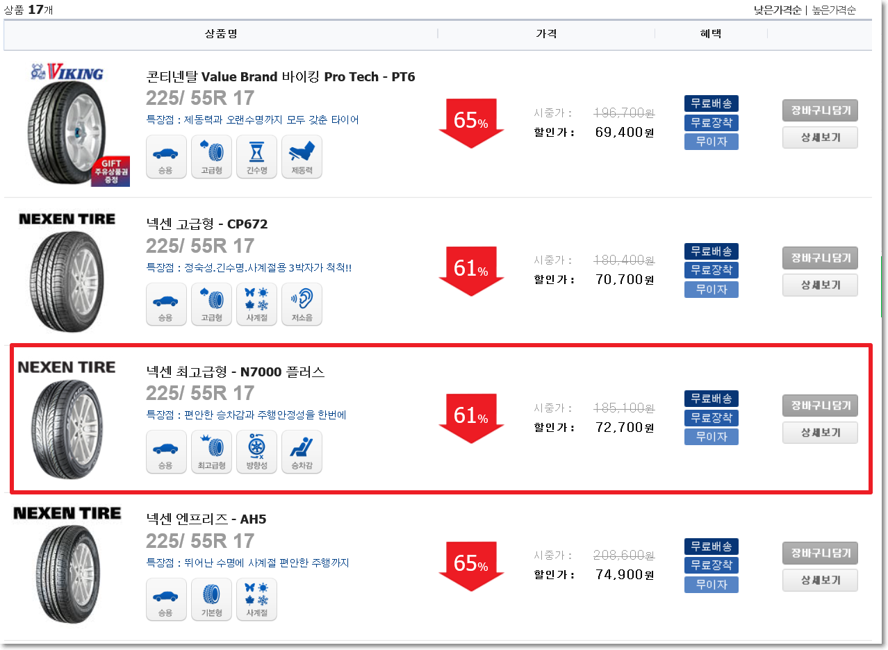 17인치 타이어를 선택하니 이렇게 타이어 회사별로 다양한 제품이 검색됩니다. 콘티넨탈 제품도 있고 넥센도 있고 그러네요. 넥센도 최고급형, 고급형 이렇게 타이어 정보도 볼 수 있어서 좋습니다.