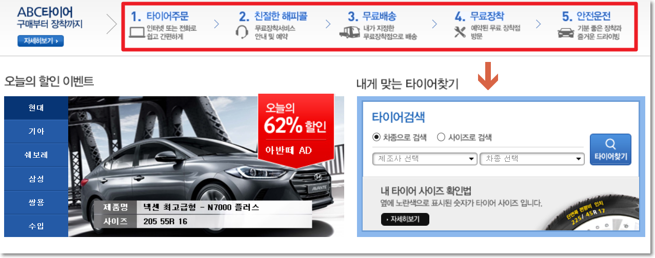 저는 온라인 홈쇼핑 사이트에서 구매했는데 이렇게 ABC타이어 홈페이지에서도 타이어 규격 검색 및 구매가 가능하더라구요.