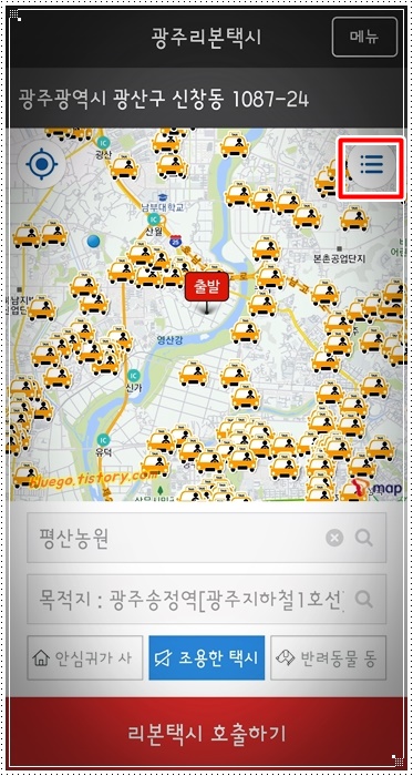 또 특이한 점 하나는 택시 위치가 보인다는 건데요. 주변에 얼마나 많은 리본택시가 있는지 보여줍니다. 광주택시조합에서 출시한 앱 답게 제휴택시가 정말 많은 것 같네요. 살짝만 지도를 줄여보아도 이렇게 많은 택시가 보입니다. 또 위 사진에서처럼 지도 우측 삼선바를 눌러보세요