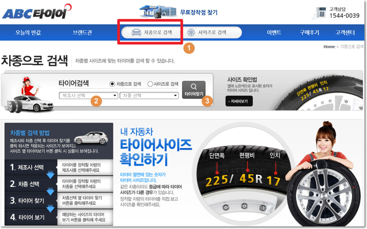 위 사이트는 abc타이어 사이트인데요. 여기 홈페이지에 가시면 차종으로 본인 차량에 맞는걸 선택하실 수 있습니다. 또 가격비교도 되니 한번 이용해보시기 바랍니다.