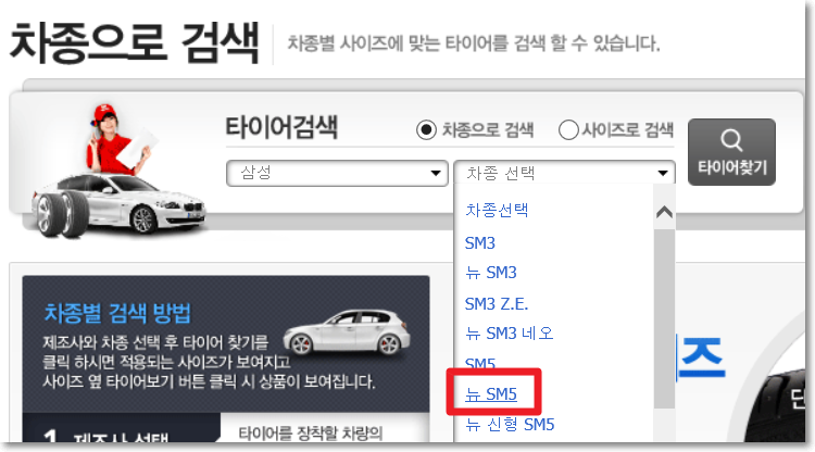 삼성자동차 중에서 뉴sm5를 선택해볼까요 그리고 나서 검색버튼을 눌러주세요