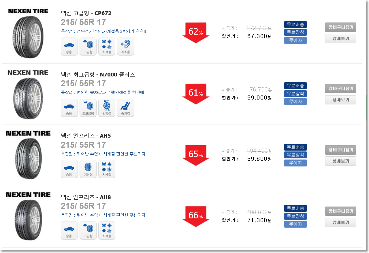 17인치도 다양한 상품이 있습니다. 넥센 최고급형 n7000도 있구요. 엔프리즈 AH5, AH8 등 제품도 보이네요. 이 제품들 사이즈는 바로 215/55r 17 입니다. 타이어 옆면을 보면 이 세가지 숫자가 적혀 있으니 다시 한번 확인해보시면 될 듯합니다.