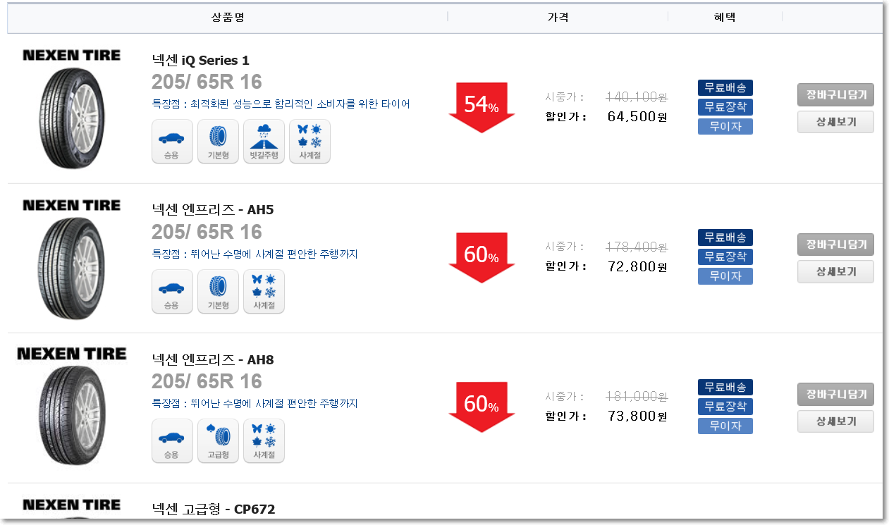 16인치 타이어 입니다. 넥센 시리즈가 보이네요. 가격보시교 장착방식을 고르면 됩니다. 무료장착점을 고르시면 되구요 직접 장착이 가능하신 분들은 무료배송으로도 되겠죠?