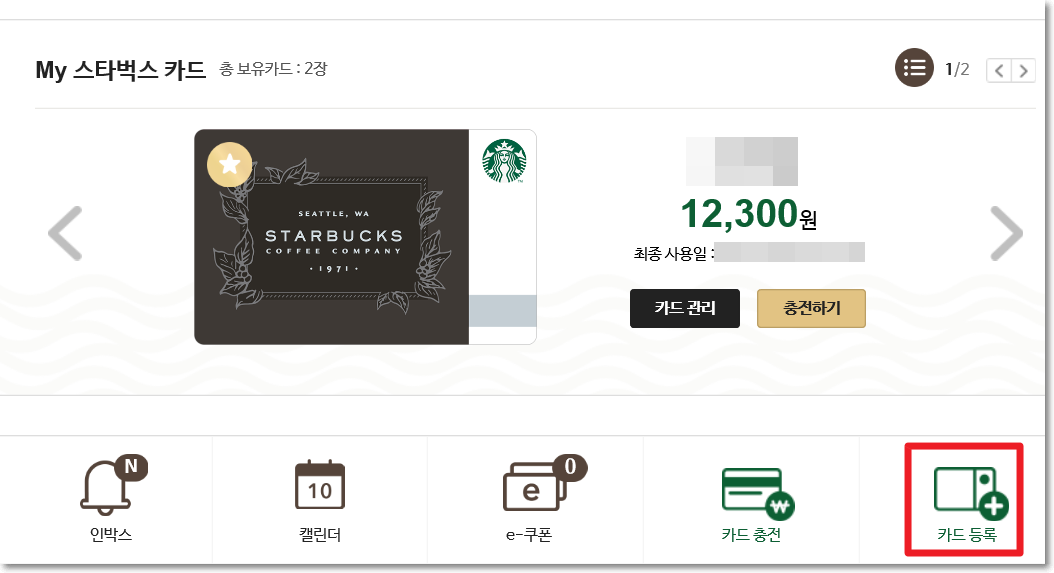 로그인 하시고 My strabucks 메뉴에 들어가면 본인 등급이 보이실거구요. 카드가 등록되어 있다면 카드등록상태 및 잔액 등을 확인하실 수 도 있습니다. 물론 홈페이지에서 충전도 가능하구요