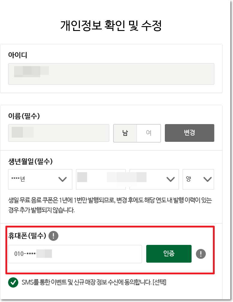 개인정보 수정에 들어가면 본인 생년월일도 입력이 되어 있습니다. 이 날짜에 맞춰 생일쿠폰이 지급된답니다. 또 아래쪽 보시면 핸드폰 번호가 들어가 있습니다. 인증을 하셨다면 이미 현금영수증이 등록되어 있을 확률이 높습니다. 또 되어있다고 하더라도 다른 핸드폰 번호로 현금영수증을 신청하실 수 있습니다.