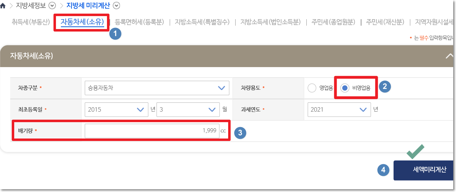 부동산 취득세도 계산하는 메뉴가 있는데요. 그 옆에 자동차세 소유 라고 표시된 곳을 눌러주세요. 그러면 차종과 용도 그리고 등록일자 과세연도 등을 선택후 배기량을 입력합니다. 배기량은 1999cc로 입력해보았어요. 그리고 세액 미리 계산 버튼을 눌러주세요
