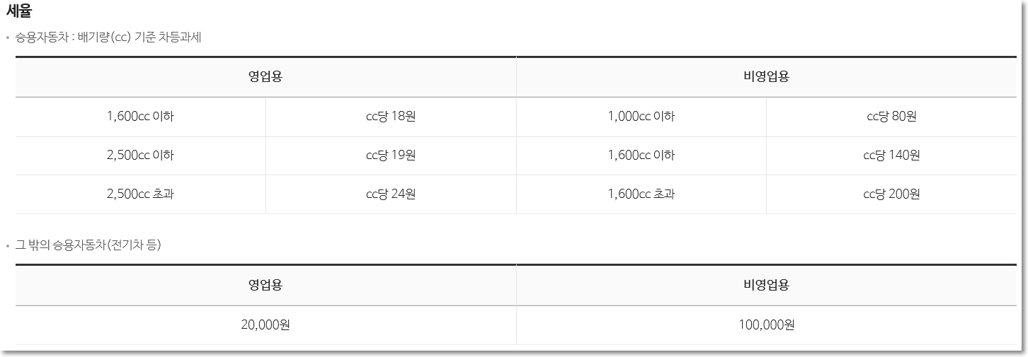 요즘 전기차도 많이 돌아다니는데요. 전기차는 생각해보니 배기량이 없습니다. 엔진이 없기 때문인데요. 그래서 그 밖의 승용자동차에 대한 세율을 별도로 정해놓았습니다. 영업용은 2만원 비영업용은 10만원이에요.