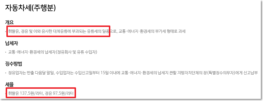자동차 소유 뿐만 아니라 주행시에도 세금이 부과됩니다. 주행은 많이할수록 많이 세금을 내는 구조입니다. 그럼 언제 내느냐? 기름을 넣을때 세금을 내신다고 보면 됩니다. 휘발유는 1리터에 137.5원, 경유는 97.5원입니다. 그러니 자동차는 사는 순간부터 세금이라고 보시면 됩니다. 가만히 세워둬도 세금 타고 다녀도 세금.. 그러니 꼭 필요한 경우에만 타는게 좋겠습니다.