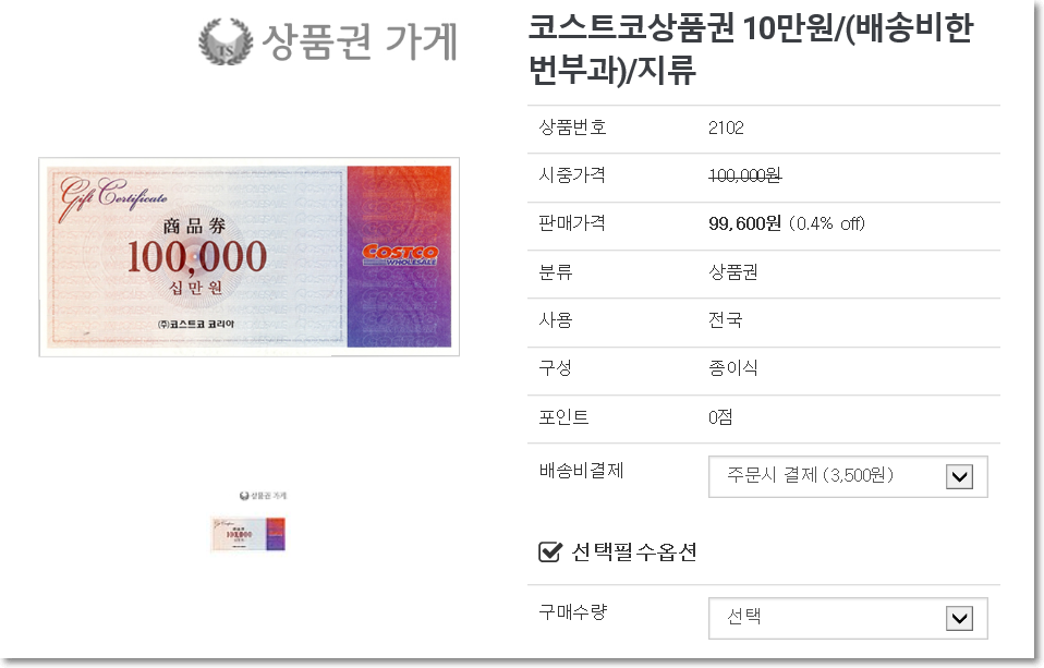 온라인에서 코스트코 상품권을 파는 것을 찾아보니 400원 할인이 되어 판매가 되고 있네요. 그런데 우편료가 있어 실제 액면가보다 조금 비싸게 구매를 하셔야 합니다.