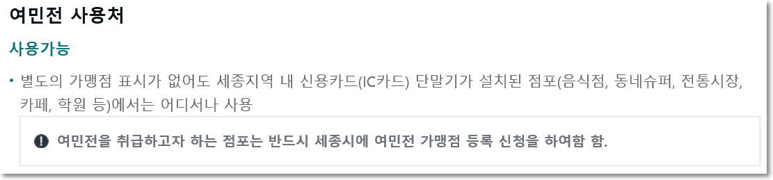 단 세종시에 위치하고 있더라도 여민전 가맹점 등록을 안했다면 사용이 안됩니다. 혹시 모르고 계신 사장님이 있다면 꼭 등록하시라고 알려주세요
