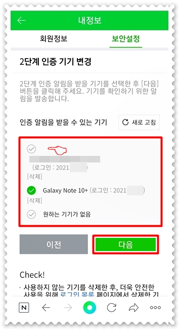 변경 화면에서는 내가 로그인 한 기기가 보이구요. 현재 사용하지 않은 휴대폰에 등록체크가 되어있으면 바꾼 핸드폰으로 변경해주시면 됩니다. 그러면 이제 2단계 알림이 새로운 핸드폰으로 올 거에요