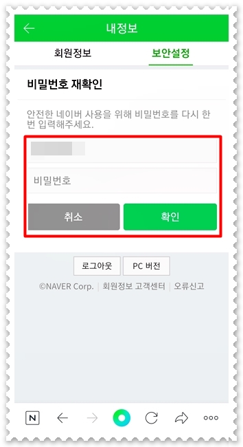 관리하기로 들어가려면 비밀번호 입력을 한번 더 해주셔야 합니다. 위 사진은 스마트폰에서 네이버앱으로 이용한 것이니 pc에서는 조금 다르게 보일수도 있습니다.