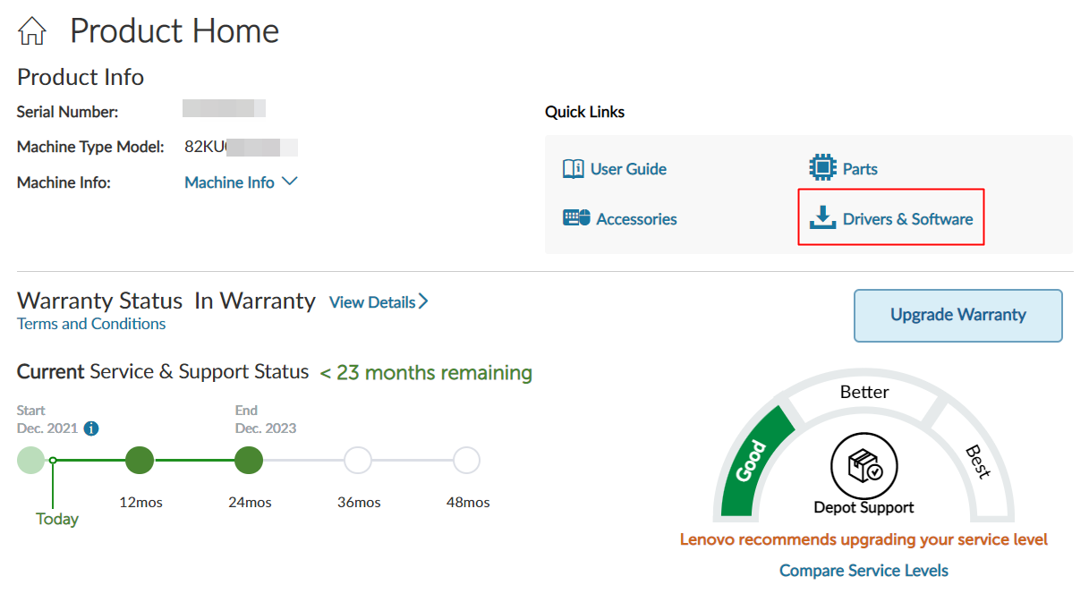 검색후 제품 정보를 보시면 보증기간까지 표시가 됩니다. 신기하네요. 여기서 보증기간을 추가로 구매하실 수 도 있어요. 드라이버나 소프트웨어를 받으시려면 우측 상단 빨간색 네모 박스된 메뉴를 눌러주세요